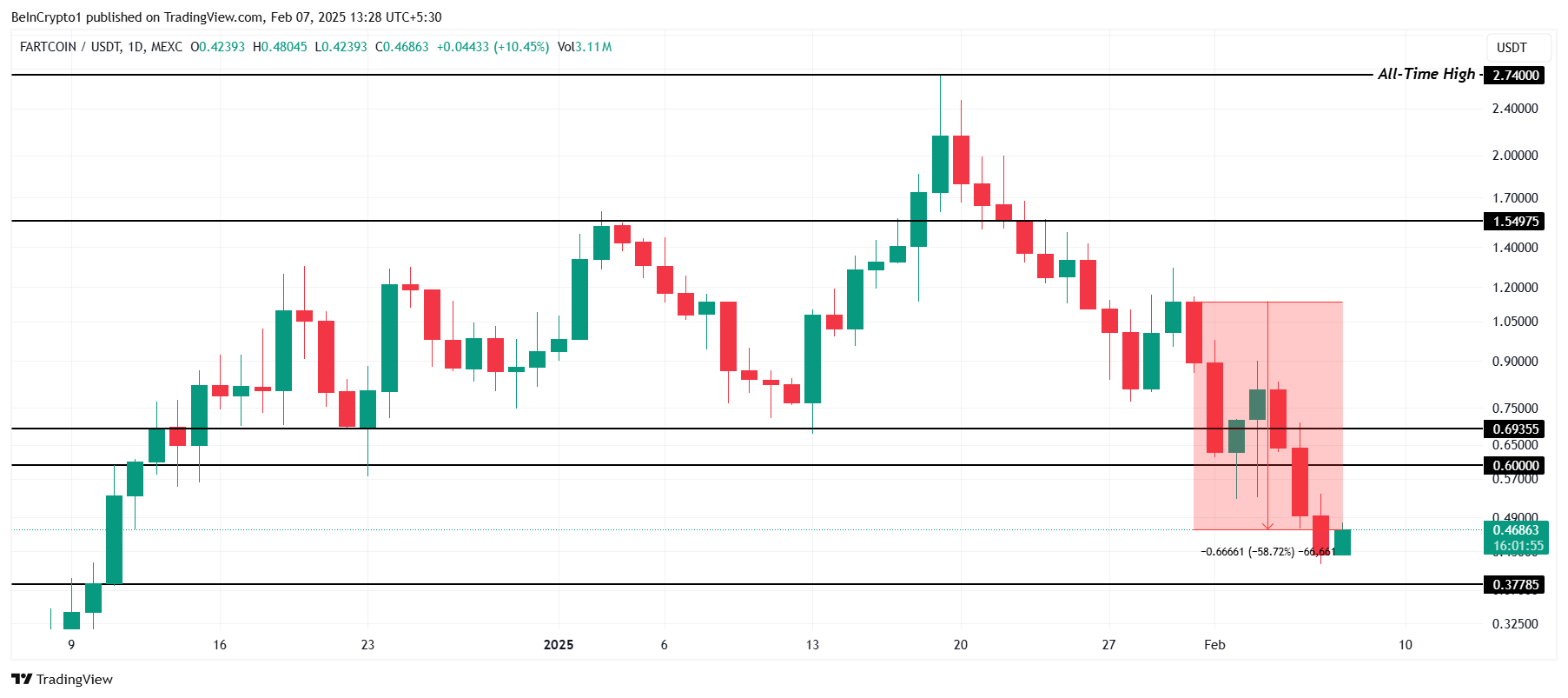 FARTCOINが0.600ドルのサポートレベルを取り戻せば、回復の可能性が残る。この障壁をサポートに変えることで、0.693ドルに向けた上昇が可能になり、この抵抗を超えるブレイクアウトは弱気の見通しを無効化し、投資家の信頼を回復させ、ミームコインの価格の広範な回復を促進する可能性がある。