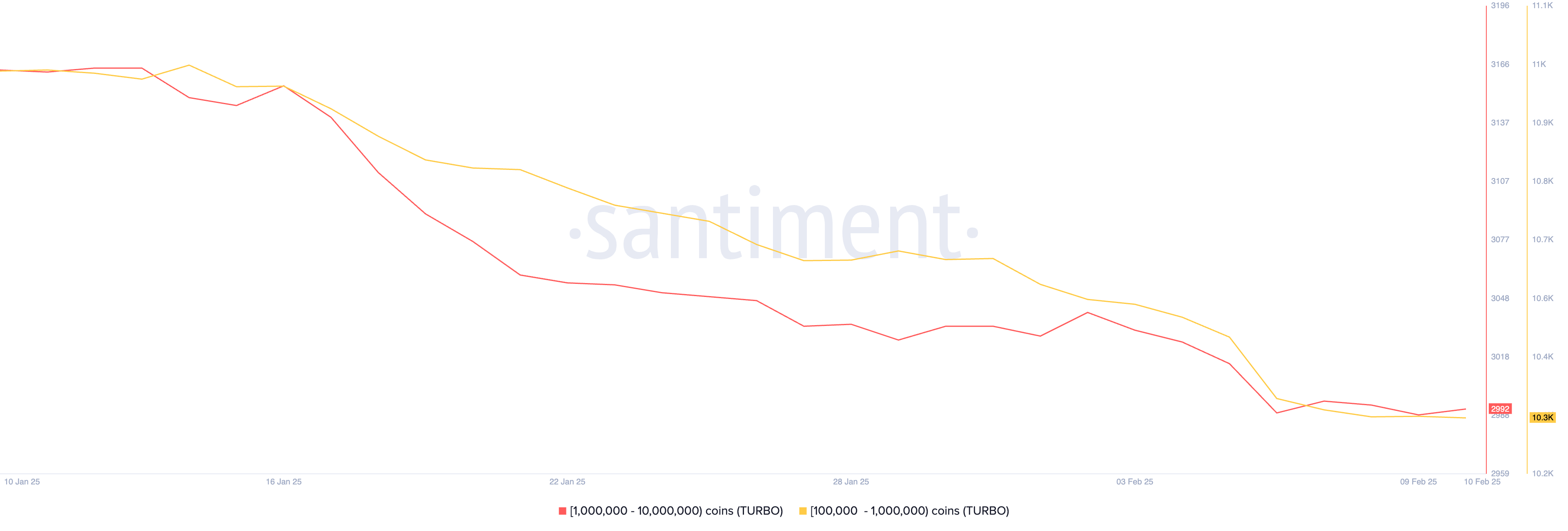 暗号資産のクジラたちは、2月の初めにTURBOも売却し、MOGやPEPEのような他のミームコインで見られるパターンに従った。1月30日には、10万から1000万TURBOを保有するアドレスの数は13706であったが、2月が始まると13404に減少した。