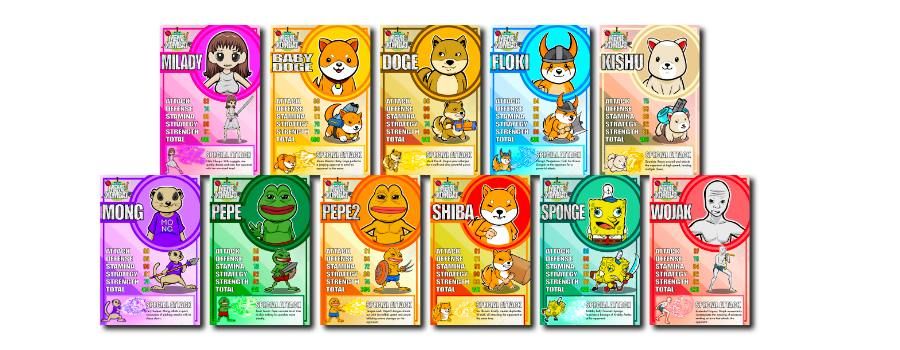 シーズン1でバトルできるミームキャラクターは、Milady、Baby Doge、Doge、Floki、Kishu、Mong、Pepe、Pepe2、Shiba、Sponge、Wojakの11種類です。
