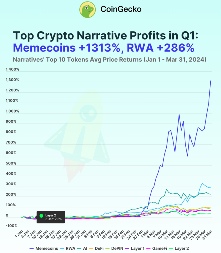2024年第1四半期、暗号資産業界で最も注目を集めたのは、平均リターンが1312.6%に達したミームコインであった。暗号資産トラッキングサイト、コインゲッコーが3日、報告した。分析は、1月1日から3月31日までの期間に、コインゲッコーのデータを基にトップ10のトークンの平均日次価格リターンを比較して行われた。