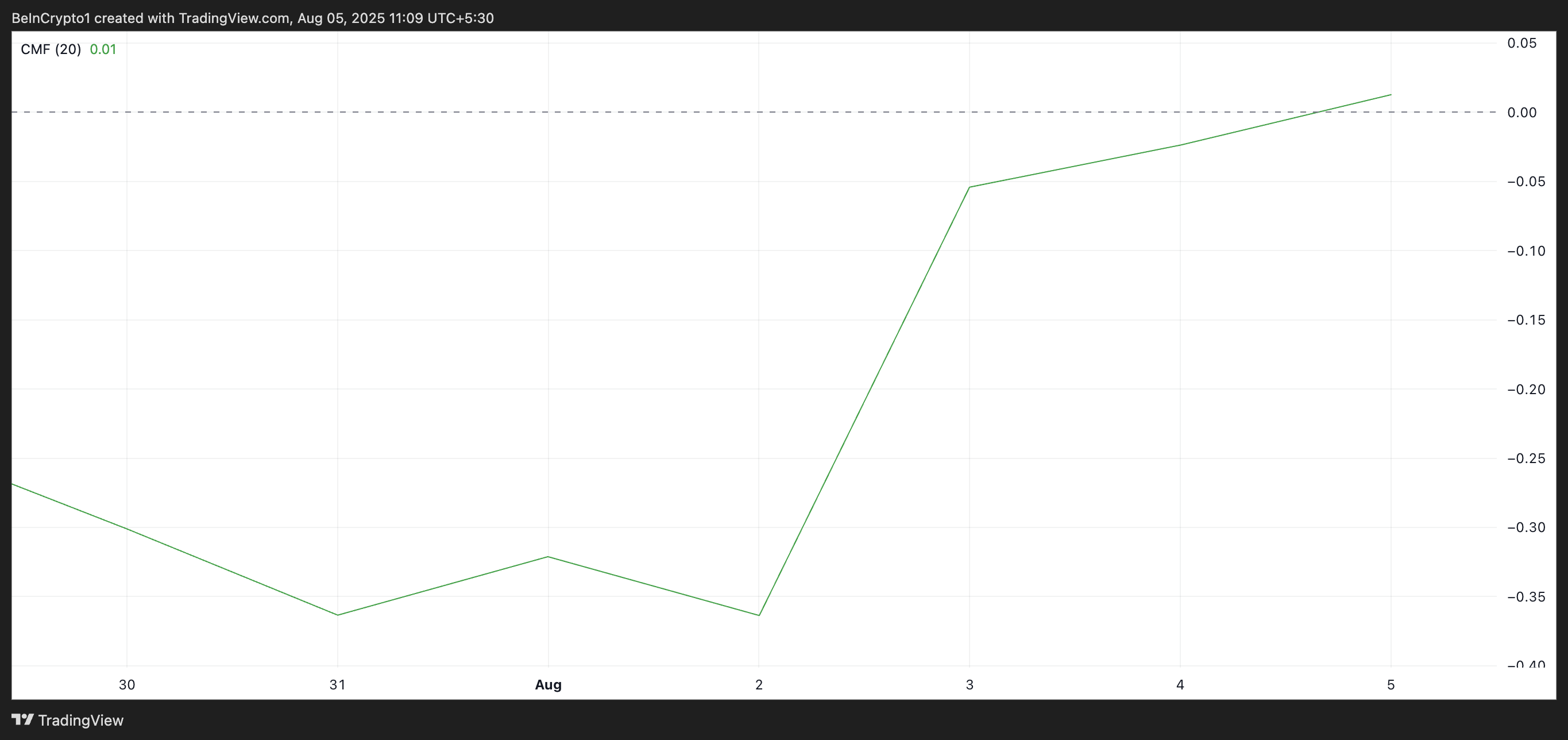現在、CMFの値は0.01となっており、ゼロラインをわずかに上回って推移している。この水準は、売り圧力よりも買い圧力が優勢になりつつあることを意味しており、上昇基調への初期シグナルとなる可能性が高い。