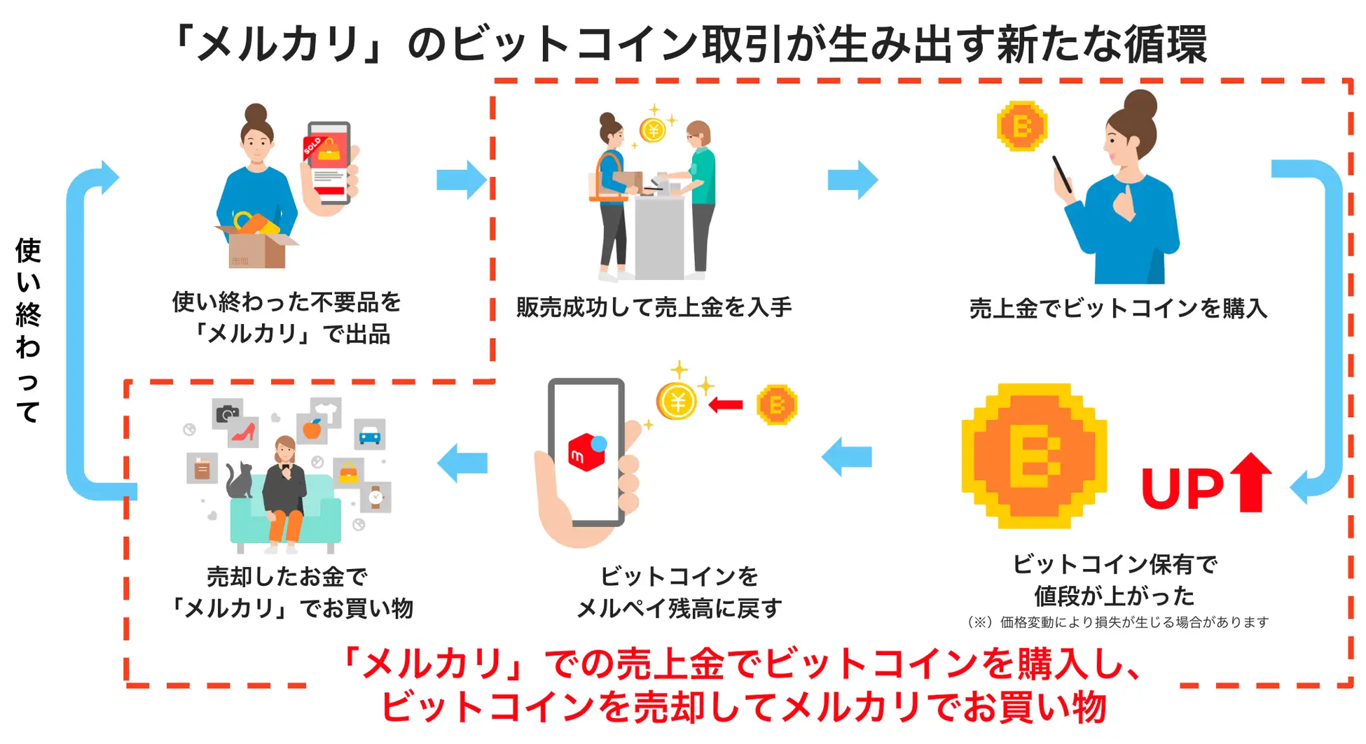同サービスは、メルカリアプリ内で取引の手続きが全て完結し、「メルカリ」で商品を売って得た売上金、ポイント、金融機関からチャージした残高などを活用して1円からビットコイン購入できるサービス。メルカリのアプリでは、本人確認が終わったユーザーは、最短30秒でビットコインの購入手続きを完了できる。マイページからビットコインの価格変動を確認したり、売却による収益をメルペイ残高に移動させて、他の購入への使用もできる。ビットコインの管理体制はメルコインが分別管理し資産管理を行なっている。