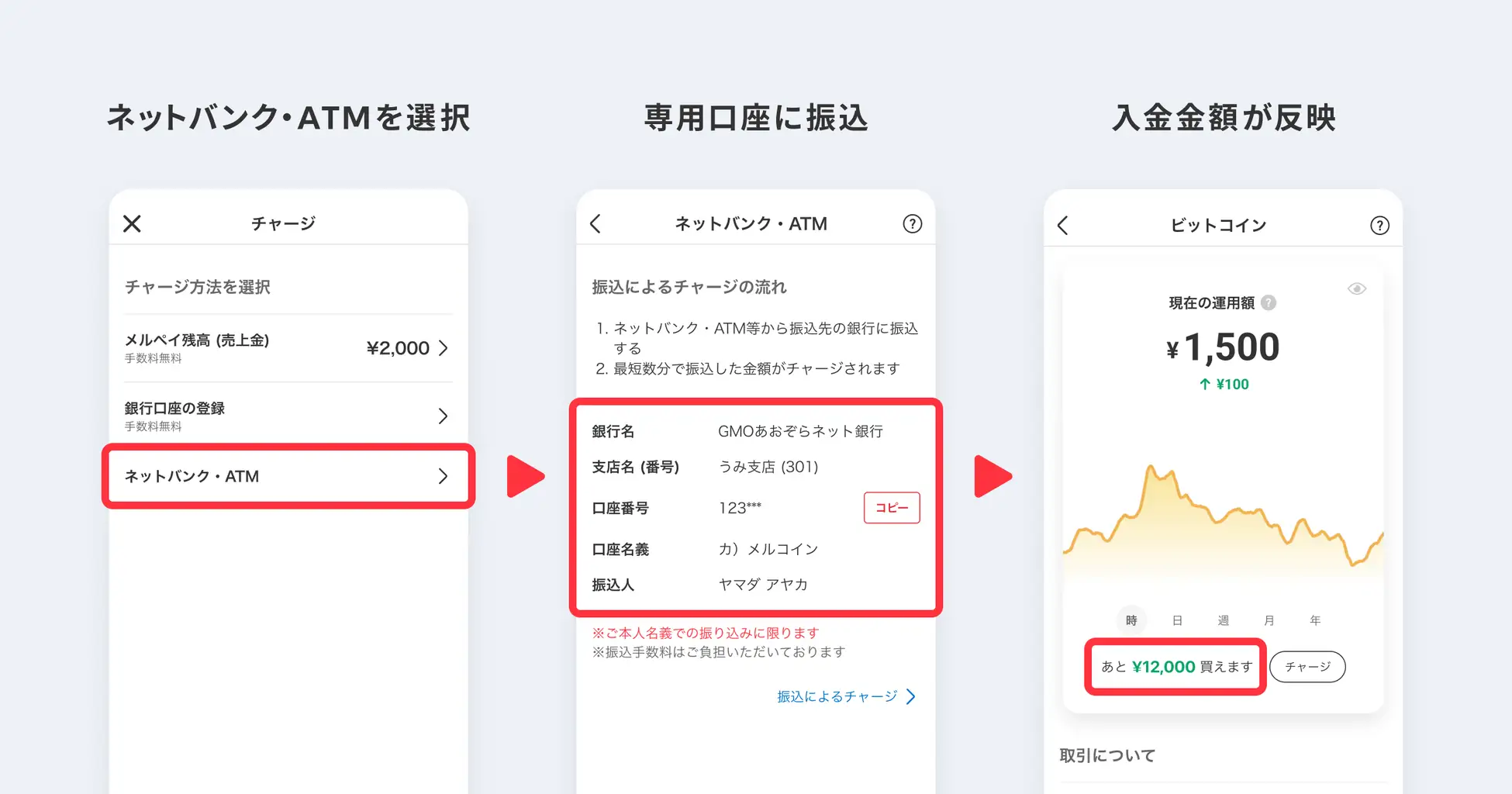 メルカリアプリ内でのビットコイン取引サービスの利用者が入金をする際に、メルペイ残高からのチャージと銀行チャージに加え、ネットバンク・ATMからの振込入金の選択が可能となった。入金に際して、ネットバンク・ATMからの振込入金による入金金額の上限はないという。また入金手数料は自己負担となる。