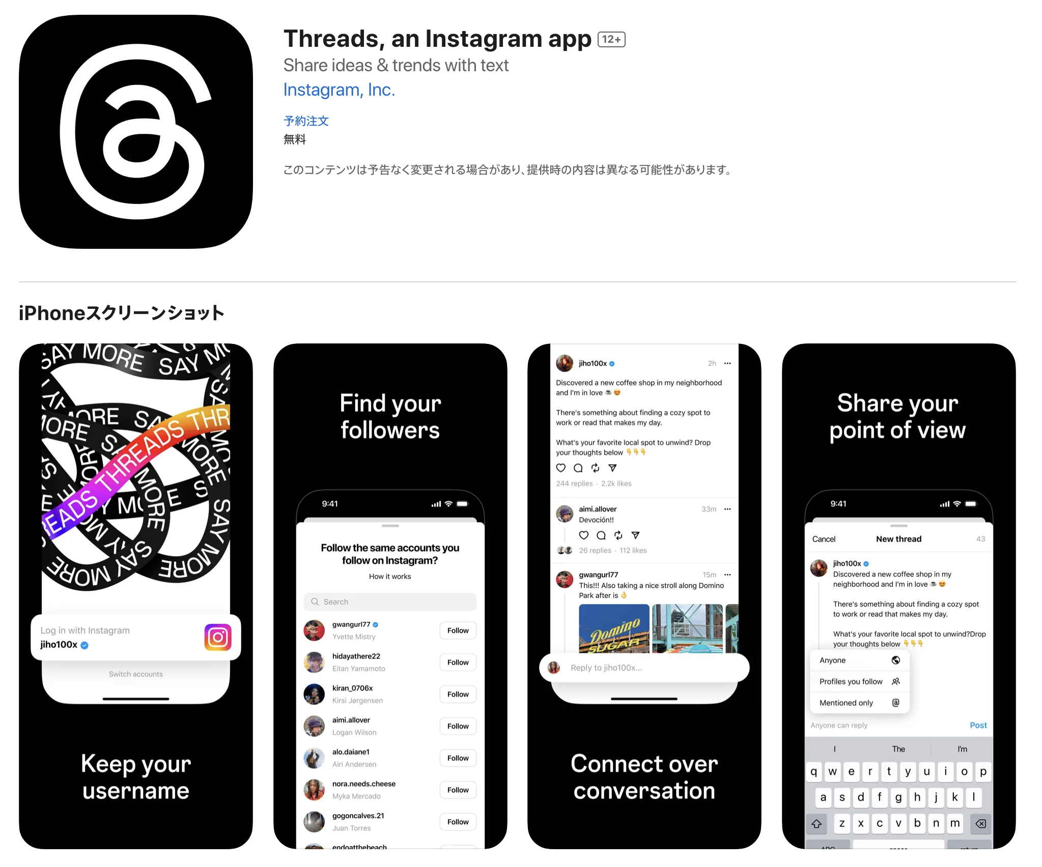 Threadsはテキストベースのコミュニケーションアプリで、メタ社傘下インスタグラムのアプリ基盤を使用したもの。ユーザーはインスタグラムのアカウントを使ってログイン可能で、同アプリのユーザーネームをそのまま利用できるという。自身と同じ興味・関心を持つユーザーをフォローできる他、自分のアイデアや意見も発信できる。4日より米アップルのApp Storeに掲載され、現在は予約注文の状態。