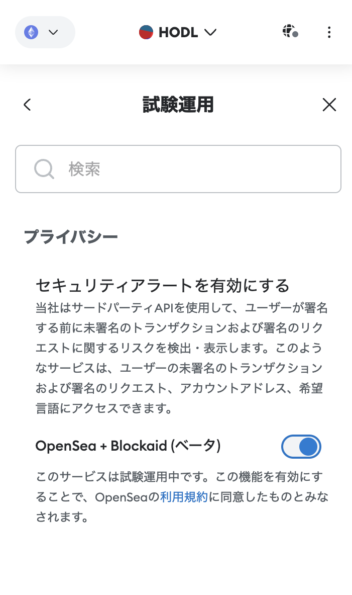 同タブを開いた後、OpenSea + Blockaid(ベータ)をスライドし、「オン」にする。