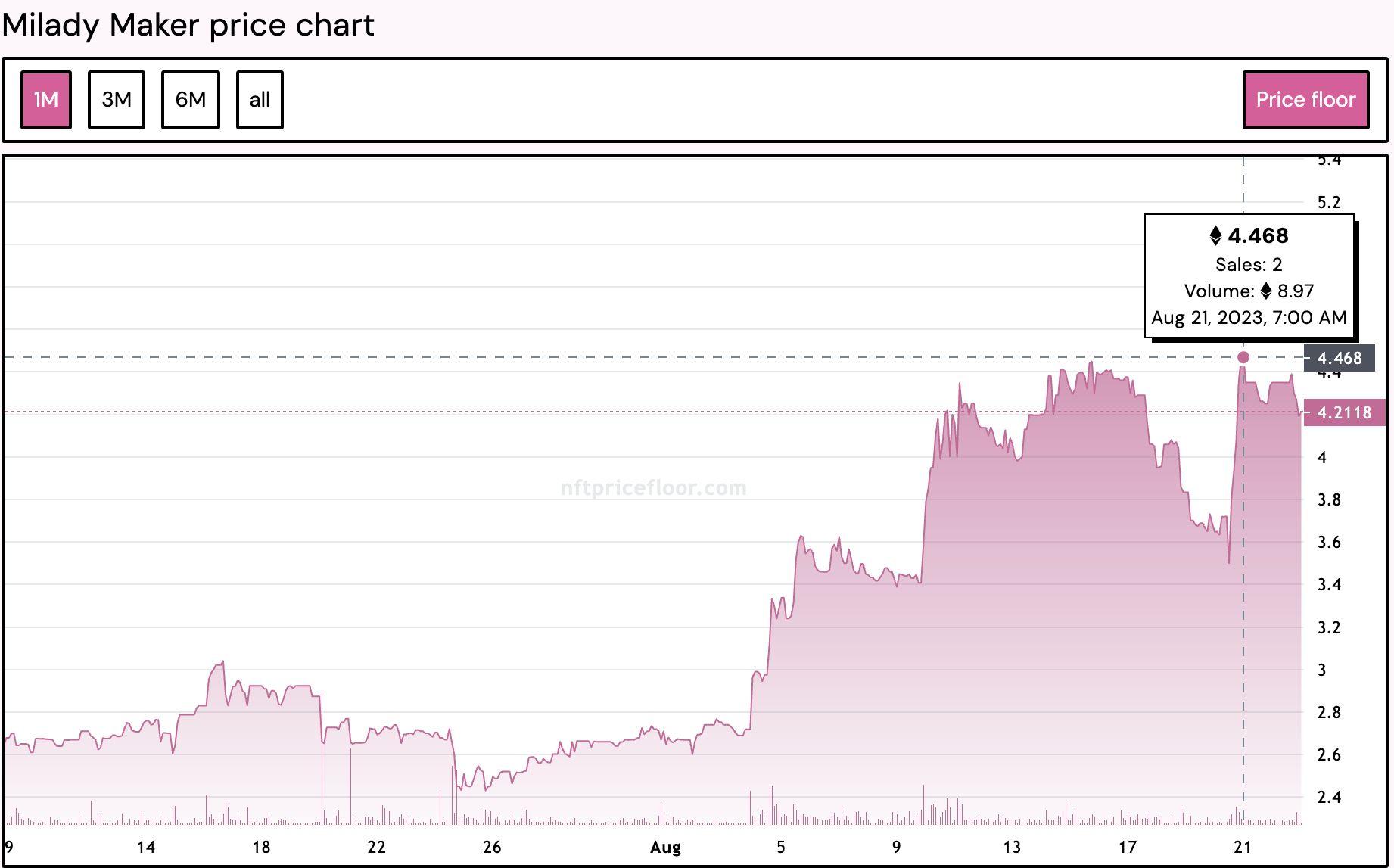 NFTプロジェクト「Milady Maker」は21日、最低取引価格(フロア価格)4.46ETH(約106万円)に達した。1日時点ではフロア価格2.71ETHだったが、月初比65%増を記録。市場全体で取引高・フロア価格ともに下落しており「NFTの冬」とも言われる厳しい市況が続く中、Milady NFTの好パフォーマンスが目立っている。