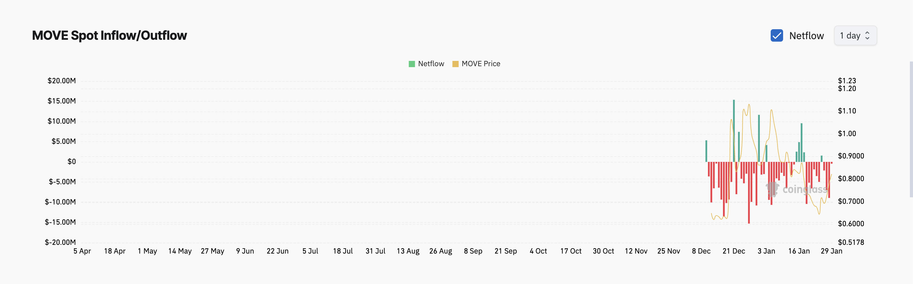 さらに、MOVEは価格の上昇にもかかわらず、スポット市場での流出を記録し続けている。Coinglassによれば、このアルトコインは4日連続で合計1900万ドルの流出を目撃している。