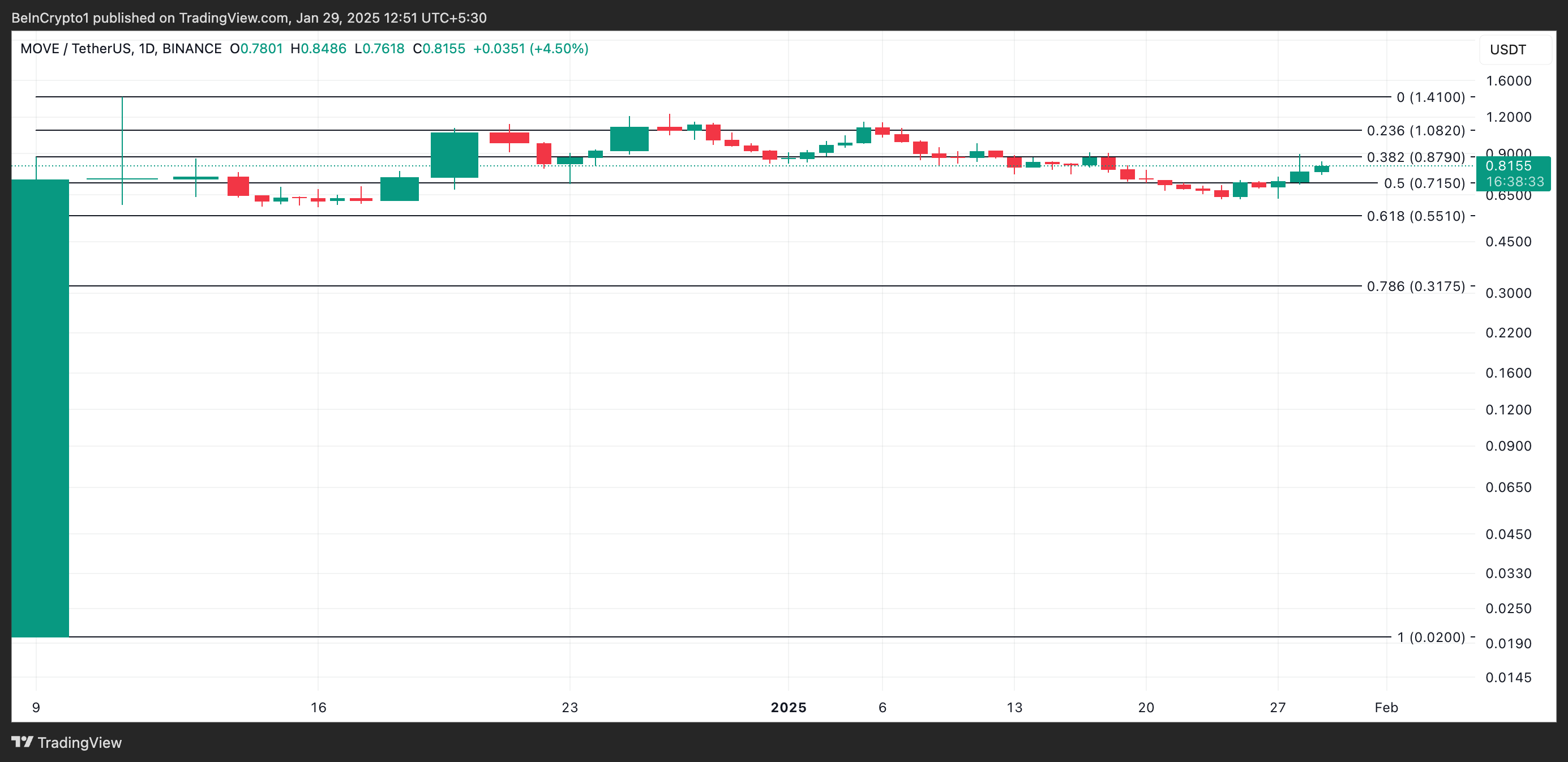 一方で、MOVEの実際の需要が急増すれば、0.87ドルを突破し、1.08ドルに向かって上昇する可能性がある。