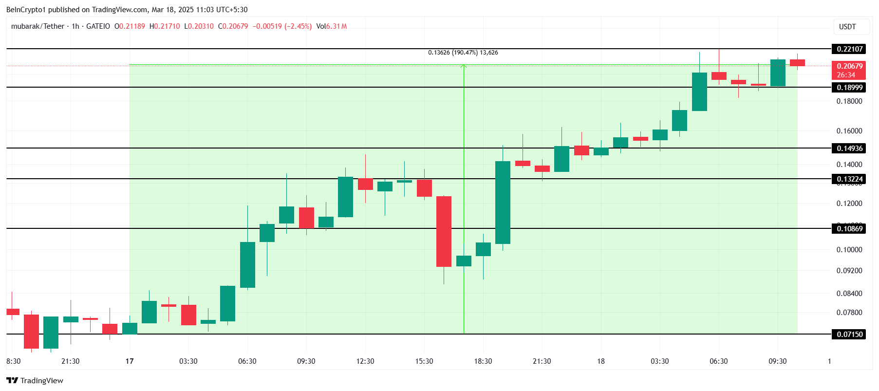 MUBARAKの価格は過去48時間で約200%上昇し、0.206ドルに達した。また、過去最高値(ATH)である0.221ドルを達成したが、このピークは長く続かないかもしれない。現在の市場の熱狂により、ATHはすぐに突破される可能性が高い。