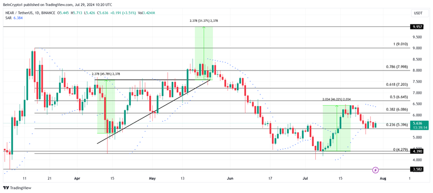 5.63ドルで取引されているNEAR価格は、フィボナッチリトレースメント23.6%ラインの上方を維持している。このレベルは、弱気相場のサポートフロアとして知られており、弱気相場にもかかわらず、アルトコインのさらなる下落を抑えている。