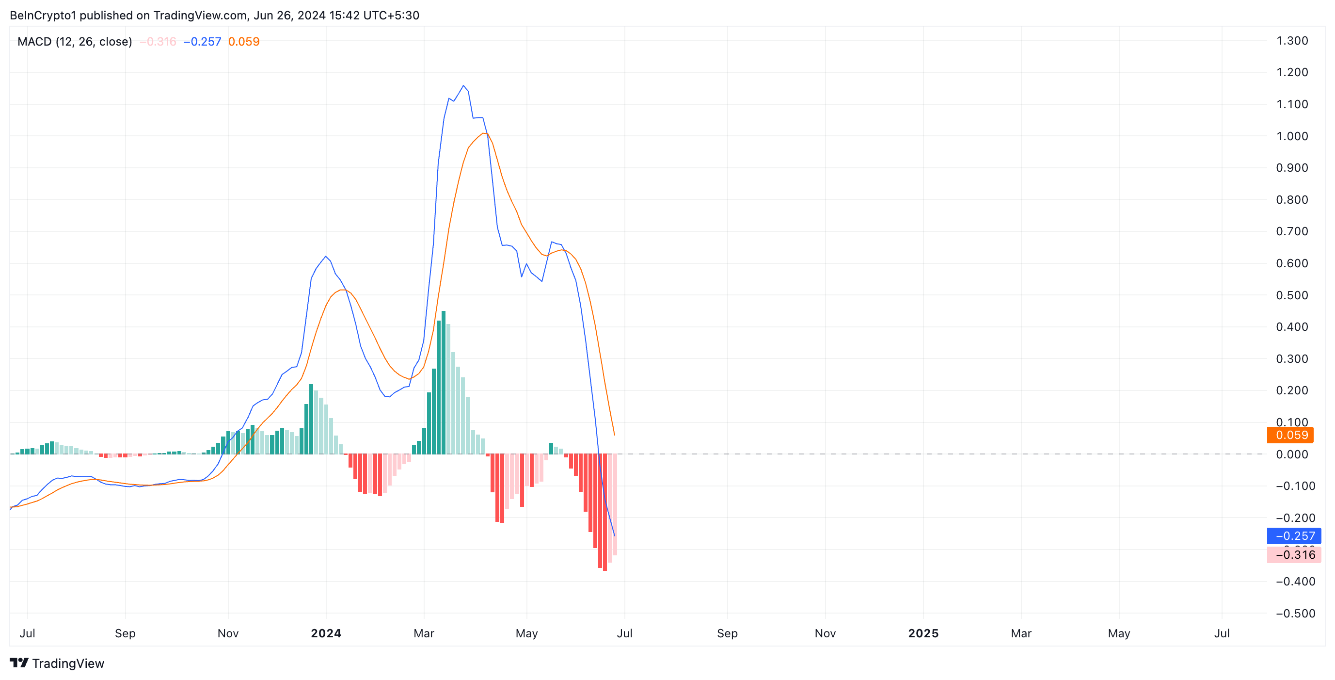 NEARの移動平均収束ダイバージェンス(MACD)インジケータは、NEARに対して大幅な弱気バイアスを示している。プレス・タイム現在、トークンのMACDライン(青)は、シグナルライン(オレンジ)とゼロラインの下に位置している。