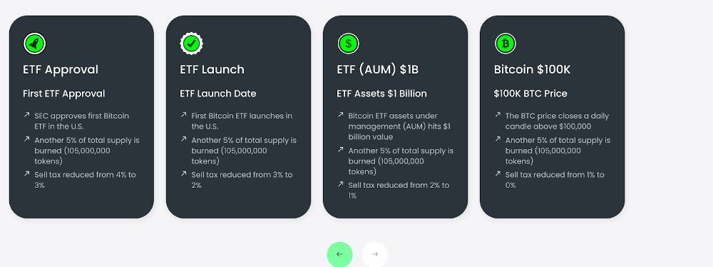 Bitcoin ETFトークンは、Bitcoin ETF承認との整合性をさらに高めるために、具体的で最先端のメカニズムによって支えられています。また、このプロジェクトには、トークン供給の一部が焼却されるマイルストーンがあらかじめ決められています。