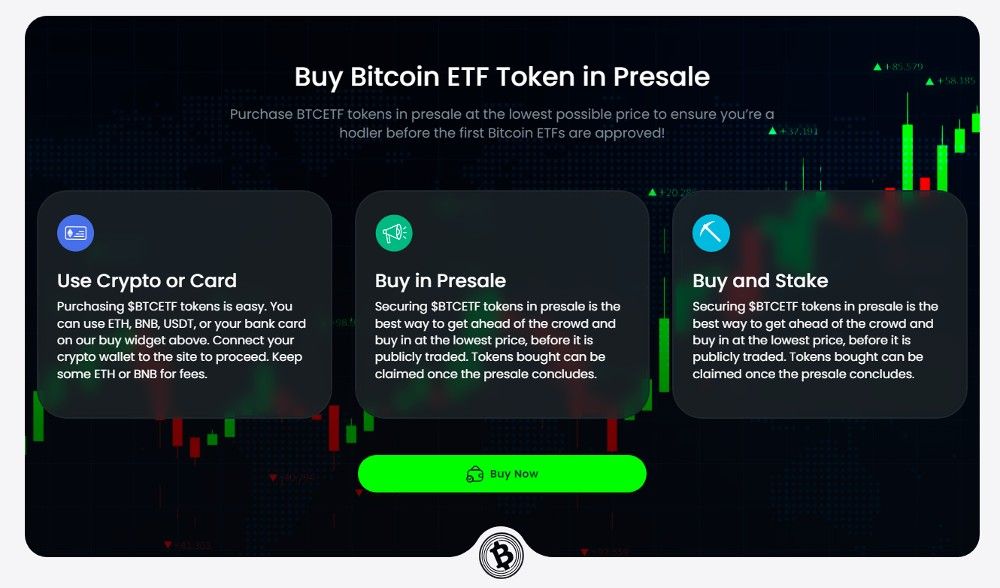 現在プレセール中であるため、BTCETFを購入したい投資家は、プロジェクトのウェブサイトbtcetftoken.comにアクセスする必要があります。BTCETFはERC-20トークンであり、プレセールではETH、USDT、または銀行カードでの支払いを受け付けています。