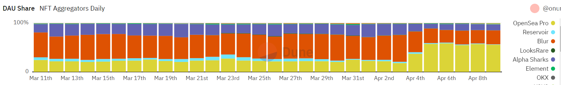 NFTアグリゲーターの市場シェアに関して、新興NFT市場「ブラー(Blur)」は3日時点で市場全体の54.8%を占めていたが、8日には27%に減少した。一方、オープンシー・プロの市場シェア率は、18%から57%に急増した。