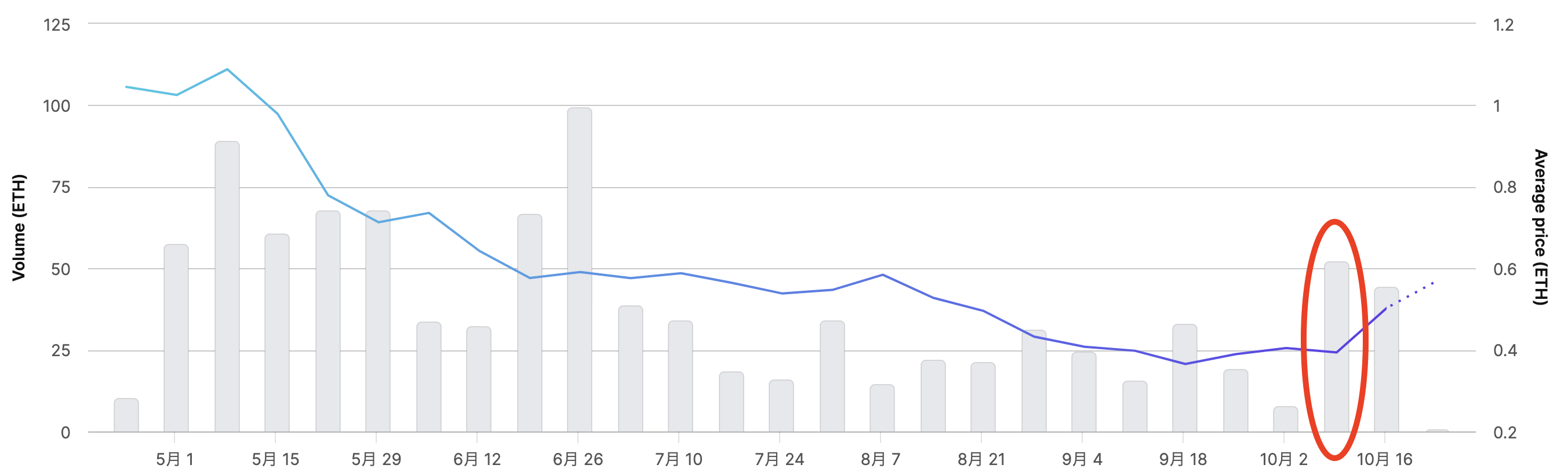 10月第2週、CNPの週次取引高は52.3712ETH、約定件数133件を記録(下記画像、赤丸)。6月最終週以来、約3カ月半ぶりの高水準となった。この週のフロア価格は0.35〜0.4ETH。同第3週、前週の取引需要増に反応し、フロア価格も上昇したかたちだ。