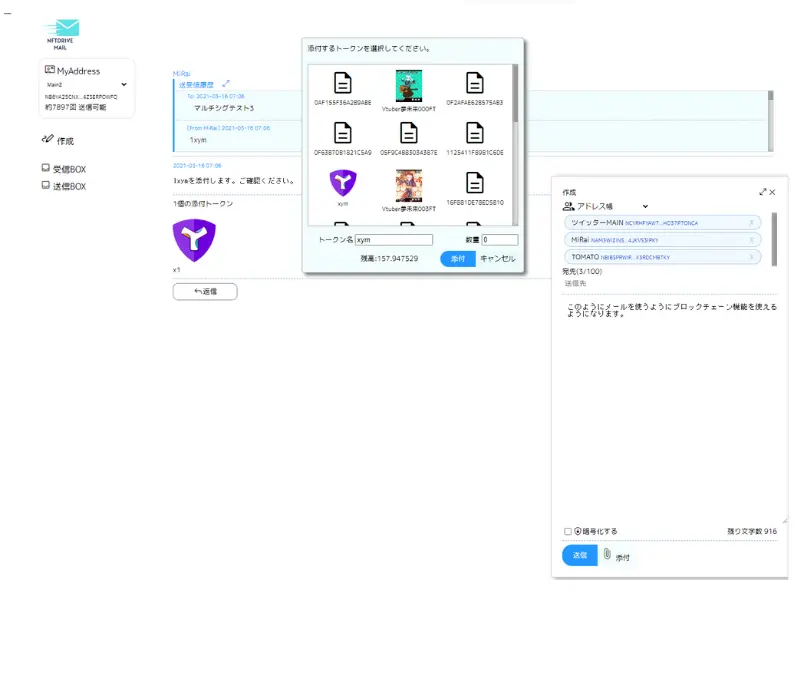 NFTDriveMailはフルオンチェーンNFTピア・ツー・ピア取引を可能にするNFT特化型国産ウォレット、「NFTDriveEX 」上で動作するアプリケーション。ユーザーは従来のメール操作と同様に、「メール送信」や「データの添付」などが行える。
