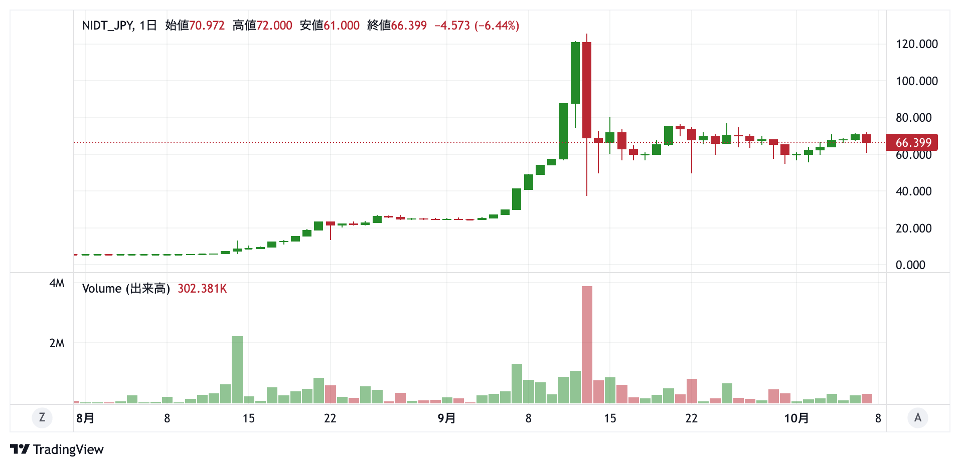 ニッポンアイドルトークンは4月、国内取引所coinbookおよびDMM BitcoinでIEOと上場を実施。IEOおよび上場価格は1NIDT=5円。上場直後に最大76%減の1.2円台まで下落し、低パフォーマンスが続いていた。しかし、8月から上昇基調が続き、9月13日に過去最高値を更新する125円を記録。IDOL3.0 Projectは同日、ファン投票による敗者復活戦「ホワイトナイトシステム:2nd」を終了。NIDTトークン保有者に対し、1000NIDTあたり1票の投票権が付与されていたが、投票終了を以てNIDTトークンの投げ売りが発生し、一時37円台まで暴落した。その後は続伸し、正式メンバーを披露した直後の7日17時頃、月初比20%増となる72円台に達した。現在価格は66.4円。