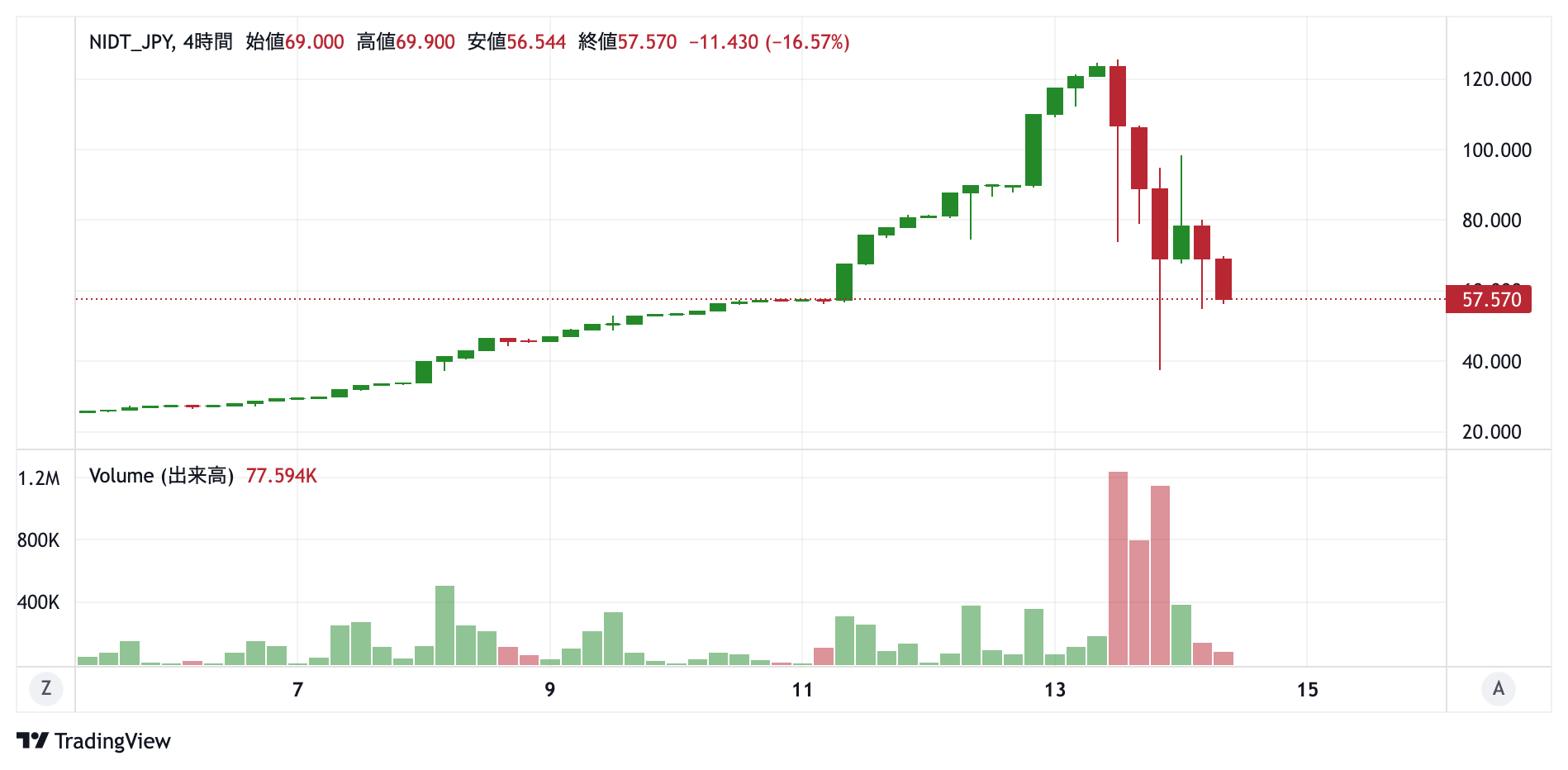 暗号資産(仮想通貨)ニッポンアイドルトークン(NIDT)は13日、国内仮想通貨取引所coinbookで一時37円台まで暴落した。本校執筆時は前日比52.9%減の58円台で取引されている。同トークンは暗号資産取引所DMM Bitcoinでも上場しておりDMM Bitcoinでは最高値の100円台から一時14円台まで急落した。