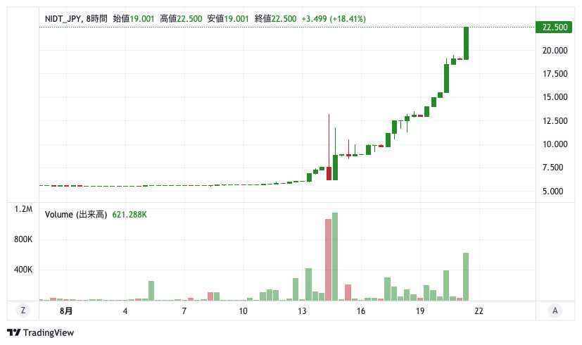 暗号通貨(仮想通貨)ニッポンアイドルトークン(NIDT)は21日、暗号通貨(仮想通貨)取引所Coinbookで22.5円を記録し最高値を更新した。NIDTを運営するオーバースは同日、投票機能をはじめとする”推し活”体験を搭載したポータルサイト「NIDTポータル Phase1」をリリースした。