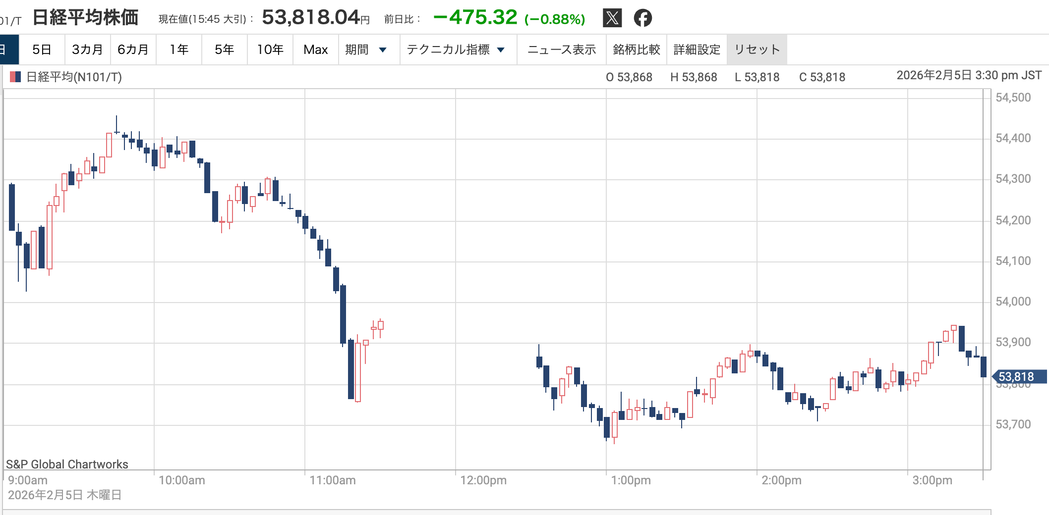 日経平均株価は5日、前日比475円32銭(0.88%)安の5万3818円04銭と2日連続で値下がりした。前日の米株式市場でハイテク株が下落した流れを受け、半導体関連銘柄を中心に売りが優勢となった。ビットコインや銀など投機的資産の急落も背景に、一部投資家の間でリスク回避姿勢が強まった。一方で東証プライム銘柄の7割超は上昇し、国内企業の堅調な決算が相場を下支えした。