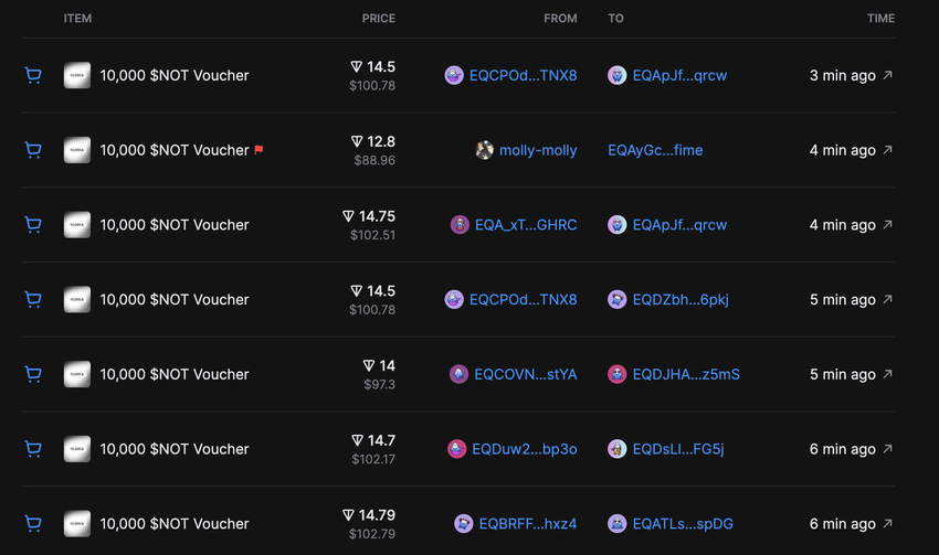 本稿執筆時点では、10,000 NOT分のバウチャーがgetgems.ioプラットフォームで12~17TONトークン(~94~124ドル)の平均価格で取引されている。