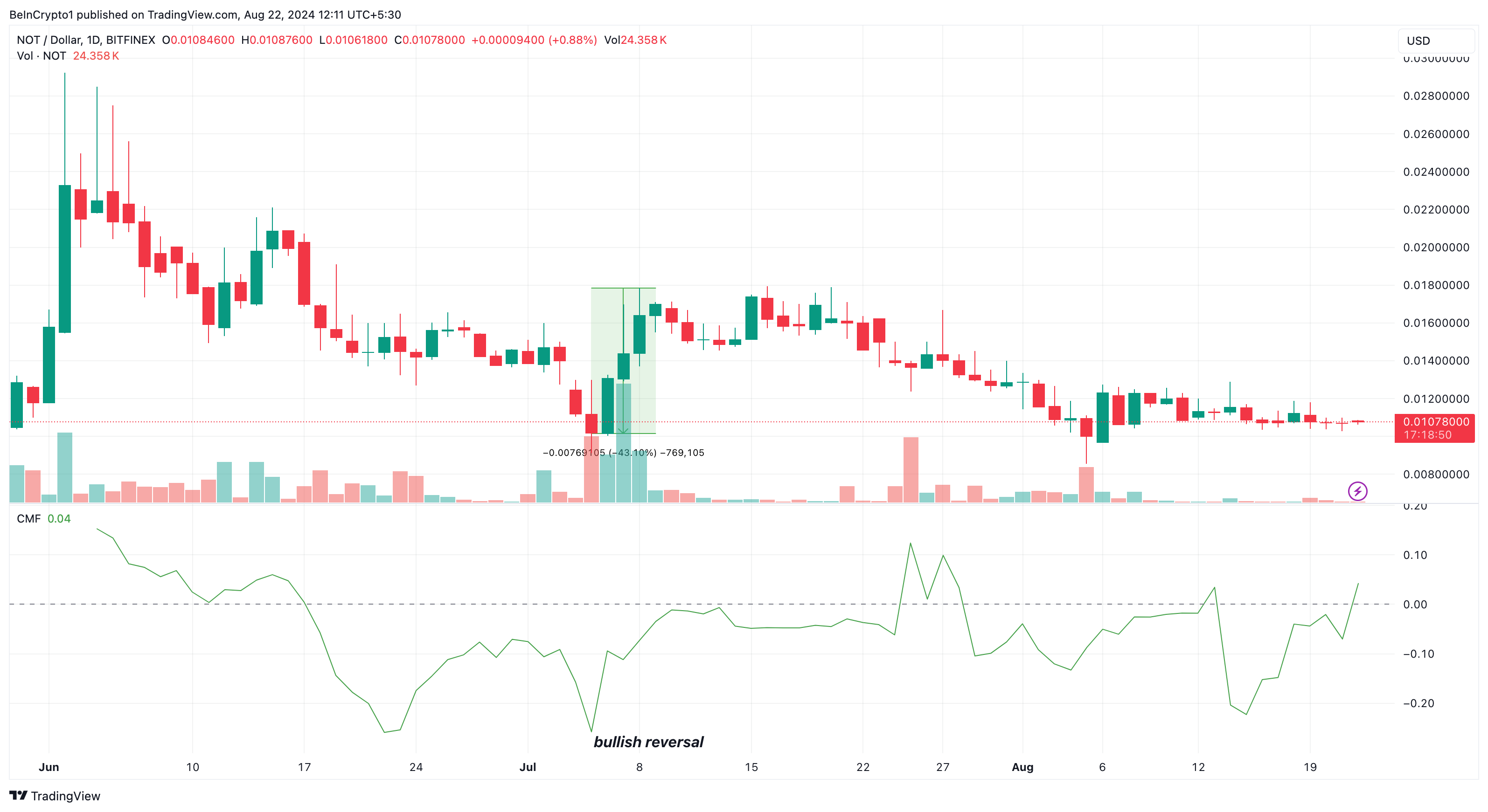 この記事を書いている時点で、ノットコインの価格は0.010ドルである。これは8月19日につけた0.012ドルからの顕著な下落であり、最終的には誤ったブレイクアウトであったことが判明した。しかし、日足チャートでは、チャイキン・マネー・フロー(CMF)がマイナス圏での推移を抜け出し、プラス側にジャンプしている。