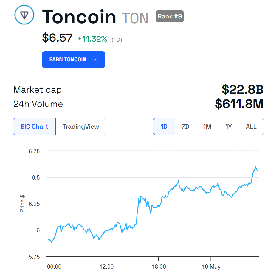 この開発は、TONブロックチェーンのネイティブ・トークンであるToncoinにポジティブな影響を与えた。その価格は過去24時間で約11.32%上昇し、執筆時点では6.57ドルで取引されている。