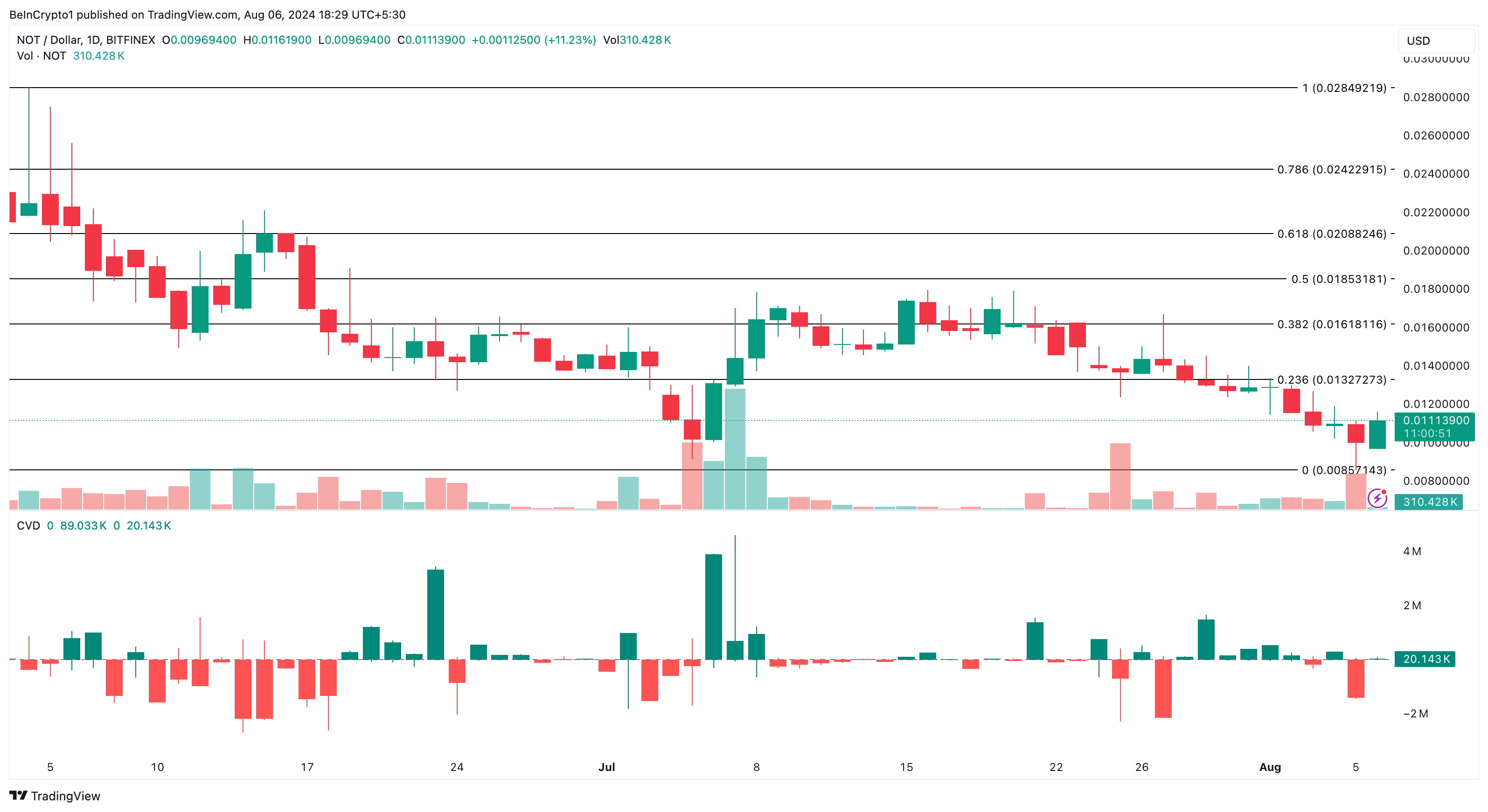 テクニカルな観点から見ると、ノットコインの市場構造は徐々に弱気優勢から脱しつつある。このバイアスに拍車をかけている指標の一つが累積出来高デルタ(CVD)です。