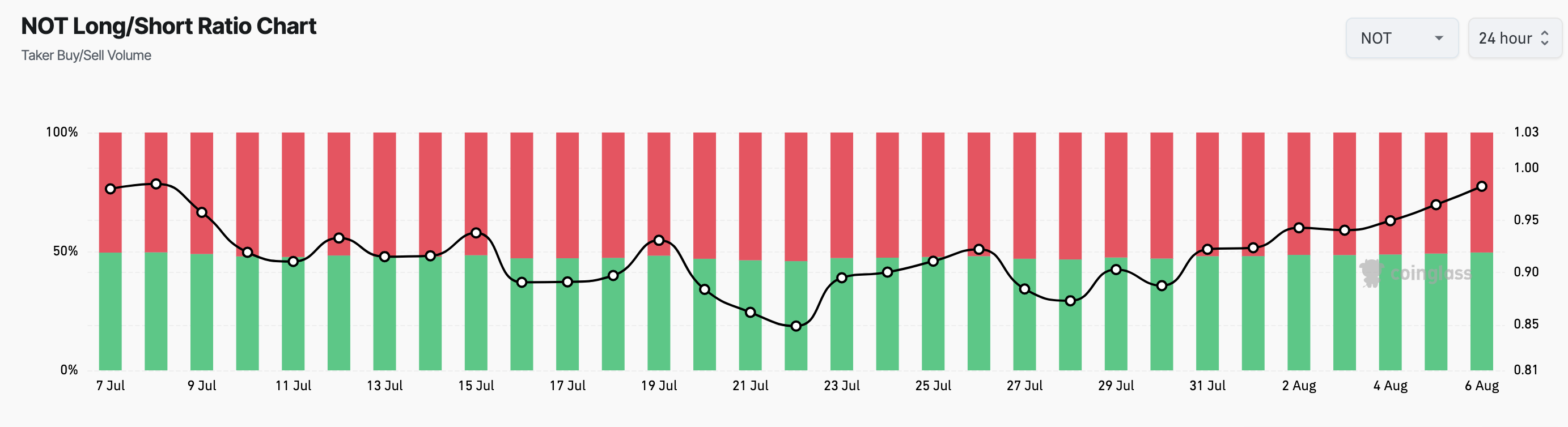 Coinglassのデータによると、NOTの場合の比率は上昇しており、多くのトレーダーがNOTCOINの継続的な上昇から利益を得るためにポジションをとっていることを示唆している。