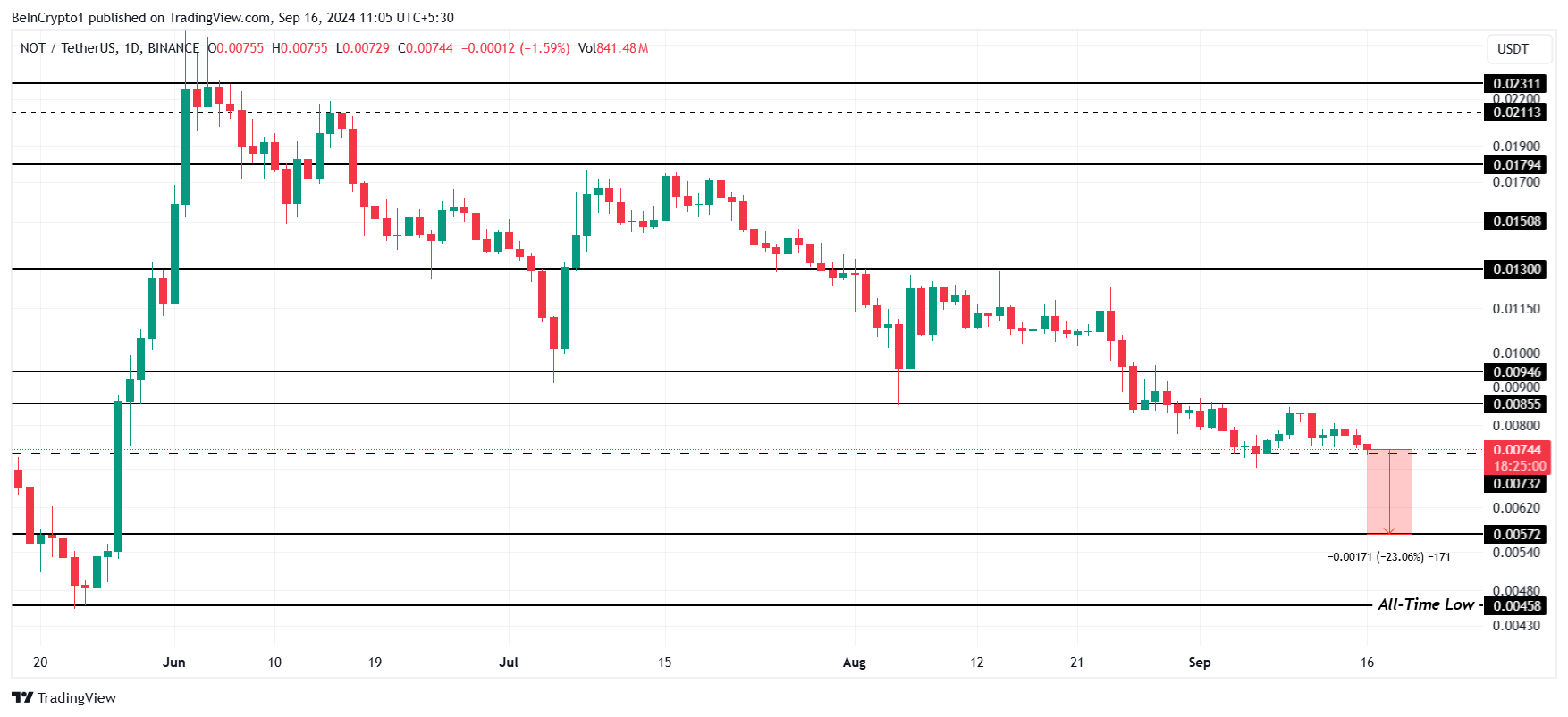 しかし、注目すべき重要なレベルは0.00732ドルで、Notcoinがこれを下回ると、投資家は大きな損失を被る可能性があります。このレベルを突破すると、急激な下落につながり、価格が暴落する可能性があります。