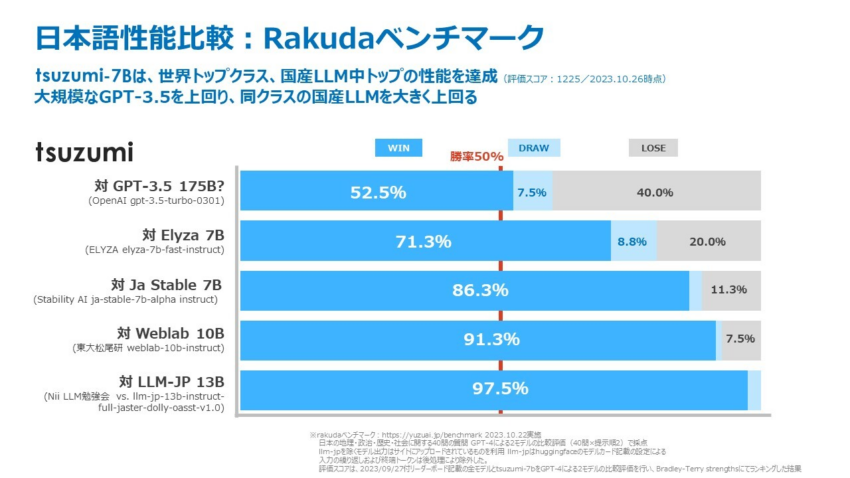 tsuzumiは和楽器の「鼓」に由来する名前を持つ生成AI 。Open AIのGPT-3が1750億のパラメータに対し、tsuzumiは超軽量版(6億)で約300分の1、軽量版(70億)では約25分の1の規模を持ちながら、GPT-3と同等の性能を25分の1のGPUコストで実現している。特に日本語の処理においては高い性能を示し、「Rakuda」というベンチマークテストでもGPT-3.5や他の国内LLMモデルより優れた結果を示した。