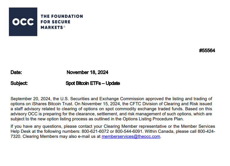 通貨監督庁(OCC)は、CFTCの承認から2日後にビットコインETFのオプション取引を開始する準備ができていると発表した。これらの取引は次の1、2日で開始される予定である。