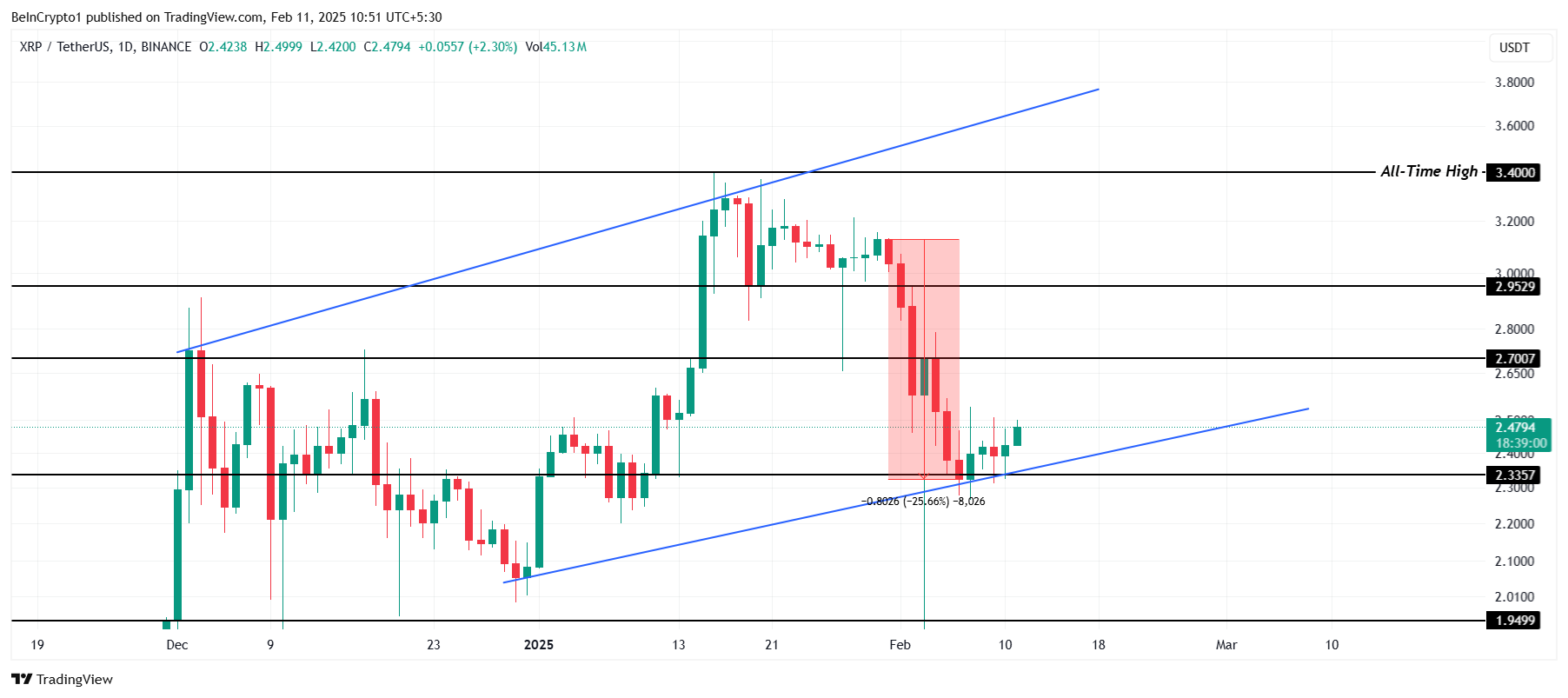 しかし、弱気の市場状況が続く場合、XRPは2.33ドルのサポートレベルに戻る可能性がある。このサポートを失うと、上昇の見通しが無効になり、価格がさらに下落する。このシナリオは投資家のセンチメントを悪化させ、回復の遅れを招く可能性がある。