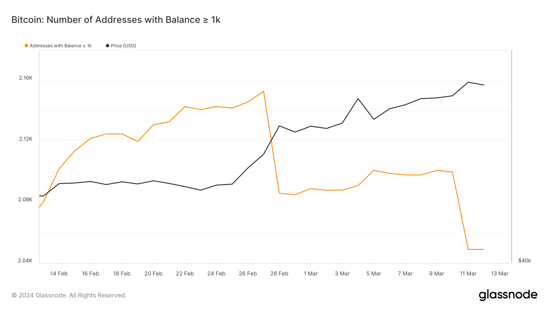 複雑さに加えて、オンチェーンアナリストのアリ・マルティネス氏は、ビットコインホエールの間の憂慮すべき傾向を強調した。Martinez氏の分析によると、1,000BTC以上の保有者は、その保有量をますます清算しており、過去2週間でそのようなアドレスが4.83%減少していることが明らかになった。