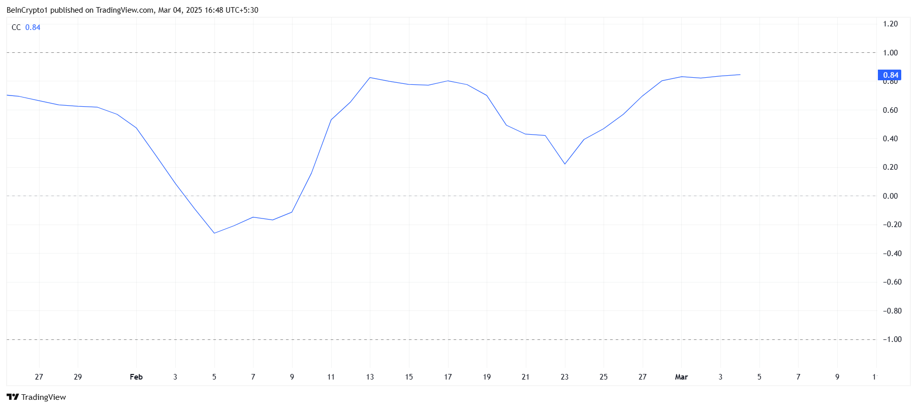 オニキスコインの価格動向は現在、ビットコイン(BTC)との相関関係に影響されている。最近、相関係数は0.84に上昇している。これはXCNがビットコインの動向に追随する可能性を示唆している。