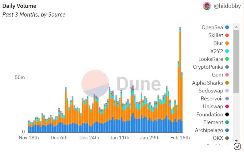 Duneの分析データによると、オンチェーンデータでは、Blurの取引量は同ネイティブトークンの導入以来、2倍以上になっているとのことである。対照的に、オープンシーの市場シェアは低下しているが、これは投資家が代替のマーケットプレイスを求めているためだ。