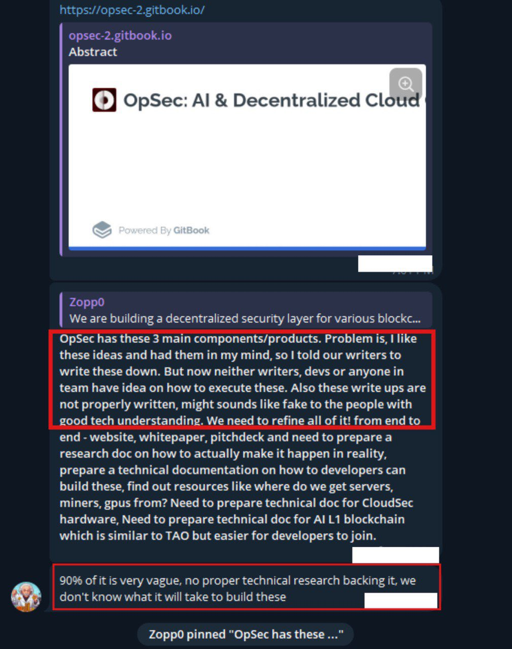ZachXBTの調査は3月に始まり、彼が証拠を投稿したとき、OpSecの称されるハードウェア能力が存在しないことが明らかになった。しかし、11月には、Zopp0がOpSecのビジネスモデルを実行する計画の完全な欠如についてオープンに議論したリークされたTelegramチャットをフォローアップした。これらのチャットから、ビジネスには実質的な核心がないことが明らかになった。