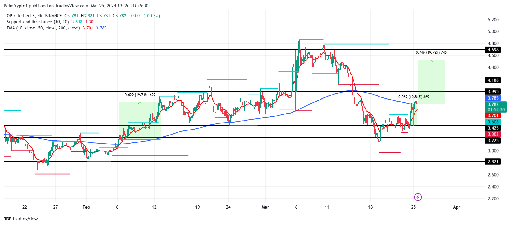 本稿執筆時点で3.78ドルで取引されているオプティミズム価格は、過去24時間に観測された10.81%の上昇を引きずっている。短期的な時間枠では、これは投資家にとってかなりの利益となり、さらなる上昇に備えることになったが、それはおそらく来ないだろう。