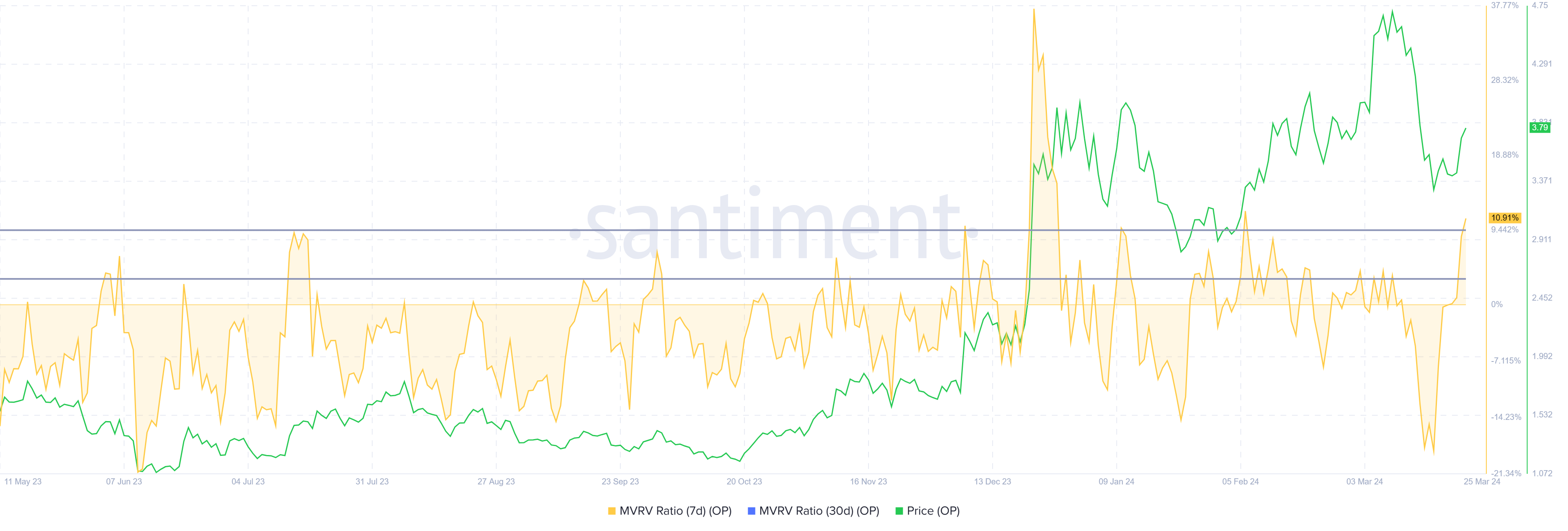 オプティミズムのMVRVは10.16%で、最近の買い手の利益が10.16%増加し、売却の可能性が高く、下降の可能性を示唆している。3%から9%のMVRVはOPの危険水域を意味し、潜在的な修正を示唆する。
