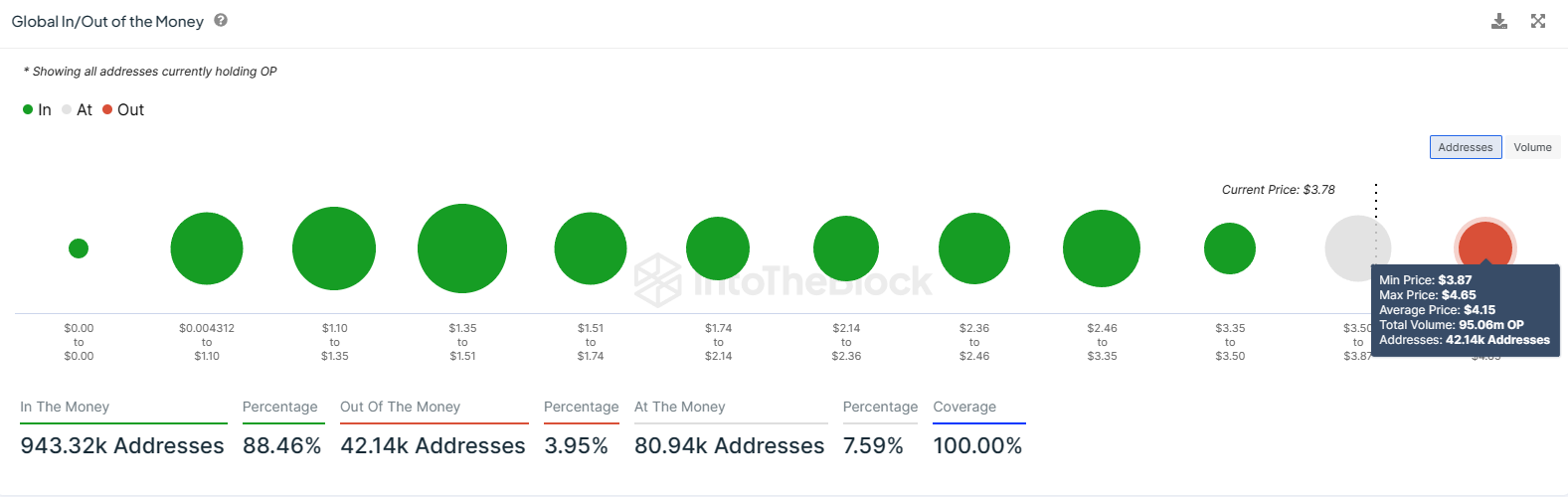 さらに、上昇の道筋を阻む大きな抵抗は、投資家が購入した9500万OPである。この供給は3.87ドルと4.85ドルのレンジ内で購入され、3億6,100万ドルに達した。