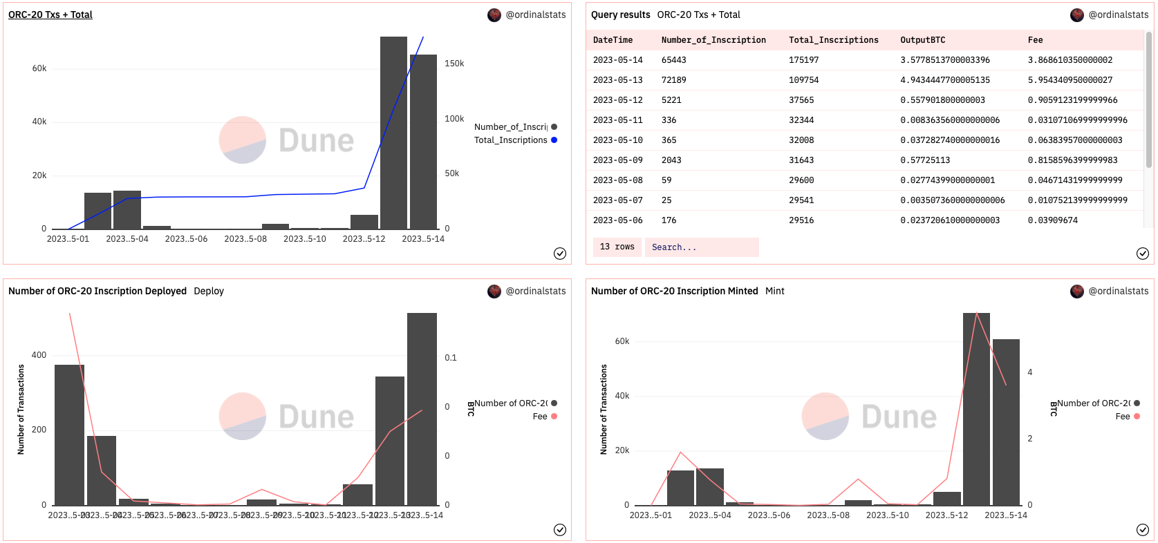 ブロックチェーンデータ分析ツールDuneアナリティクスによると、ORC-20のインスクリプション量やミント量などは、13日を皮切りに急激に増加した。同日のORC-20のインスクリプション数は前日比で約12倍を記録。ミント量も同様に急激な増加を見せている。ORC-20トークンは、11日までに420のトークンがデプロイされた。