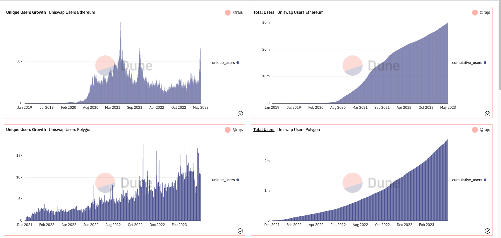 ビットコインネットワークではOrdinals InscriptionsとBRC-20トランザクションの人気により3日には、ビットコインチェーンのネットワーク手数料の総額が350万ドルに達した。これは2021年5月下旬以降の最高値であり、同日のユニスワップの232万ドルを超え、イーサリアム1723万ドルに次いで2位に位置している。さらに、暗号通貨分析サイトトークンターミナルのデータによると、ユニスワップの日別のアクティブユーザーは2日に94,550人、3日には89,755人に達し、2021年5月以来の最高値を記録している。