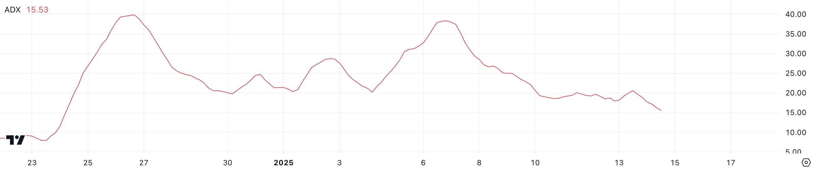 PENGUのADXは過去1日で20.5から15.5に低下し、トレンドの強さが弱まっていることを示しています。ADXが20未満の場合、市場は強い方向性のトレンドを欠いていると見なされ、しばしば統合または優柔不断を示します。