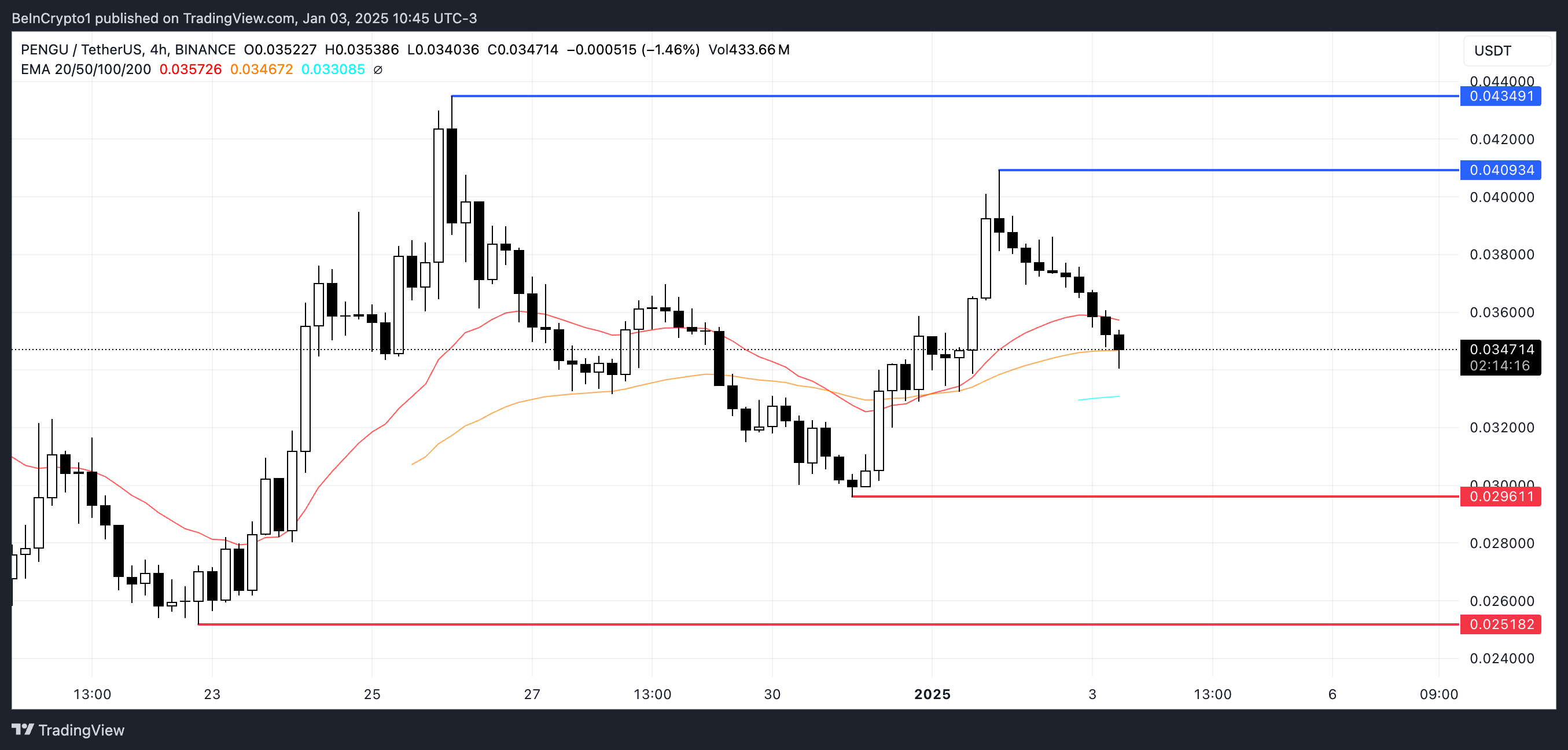 これが発生すると、現在の下降トレンドを強化し、PENGUの価格を最も近いサポートである0.0296ドルに押し下げる可能性があります。このレベルを維持できない場合、さらなる下落が予想され、次のサポートである0.025ドルで27.6%の大幅な修正が見込まれます。