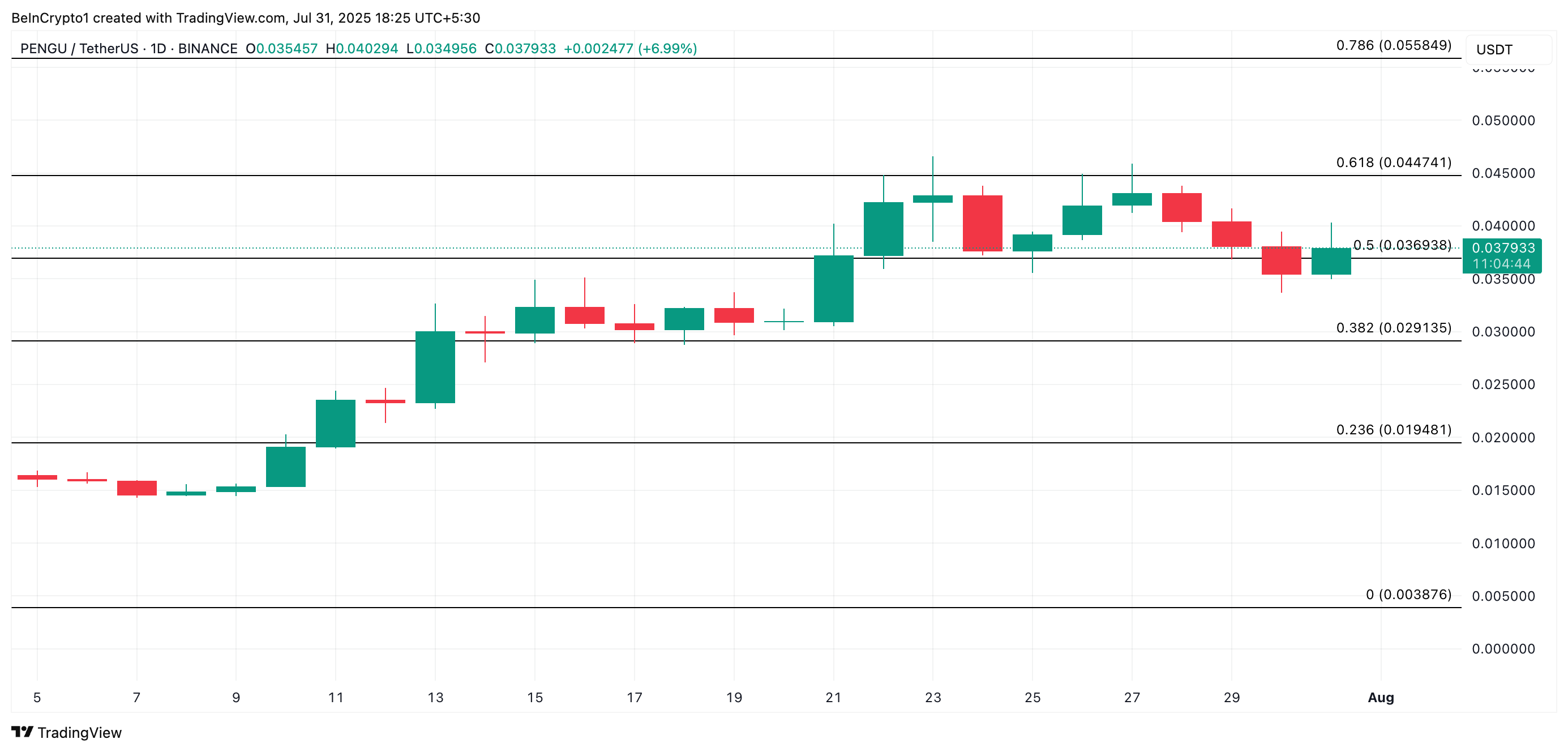 執筆時点で、PENGUは0.0379ドルで取引されており、0.0369ドルのサポートラインを上回って安定している。買いの勢いが続けば、ミームコインは流動性クラスターが位置する0.044ドルの領域に向けて上昇する可能性がある。