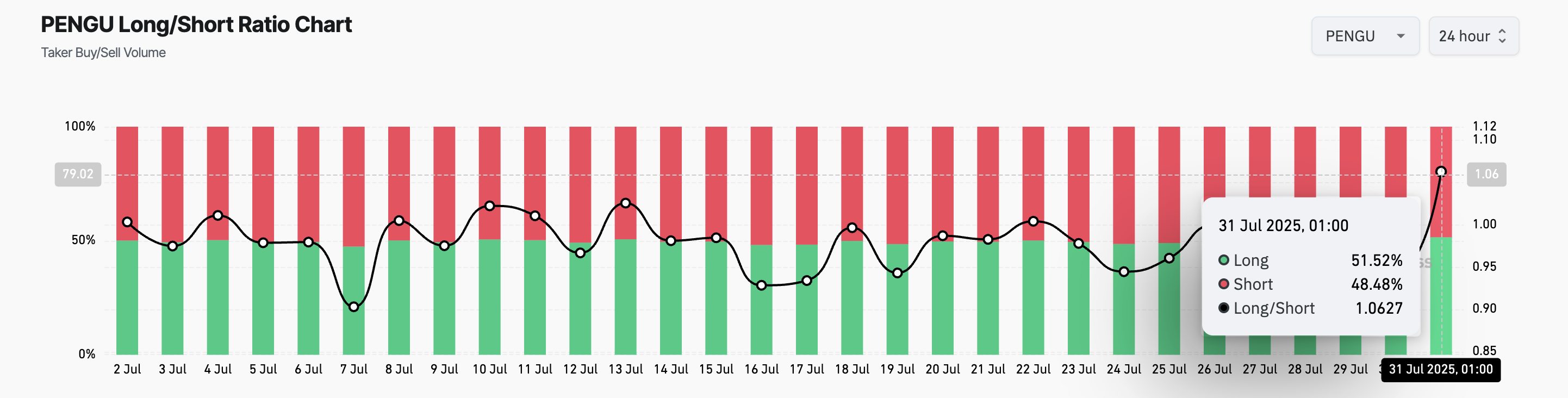 比率が1を超えると、より多くのトレーダーがロングポジションを取っていることを示す。PENGUの場合、市場参加者がさらなる上昇を見込んでポジションを取っていることを示している。