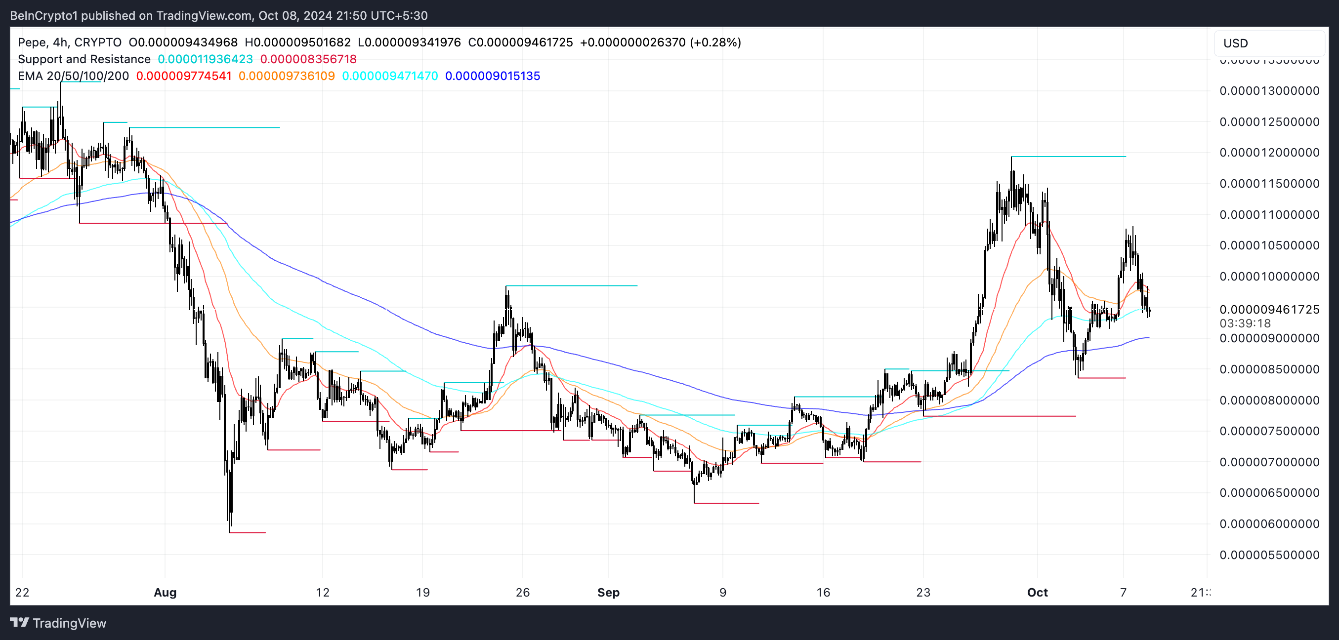 さらに、EMAラインなどの短期価格指標は中立を保っており、PEPEが近い将来重要なサポートレベルをテストする可能性があります。下降する可能性がある一方で、強気の勢いが再び増すと、PEPEは主要な抵抗レベルを再テストする方向に進むかもしれません。