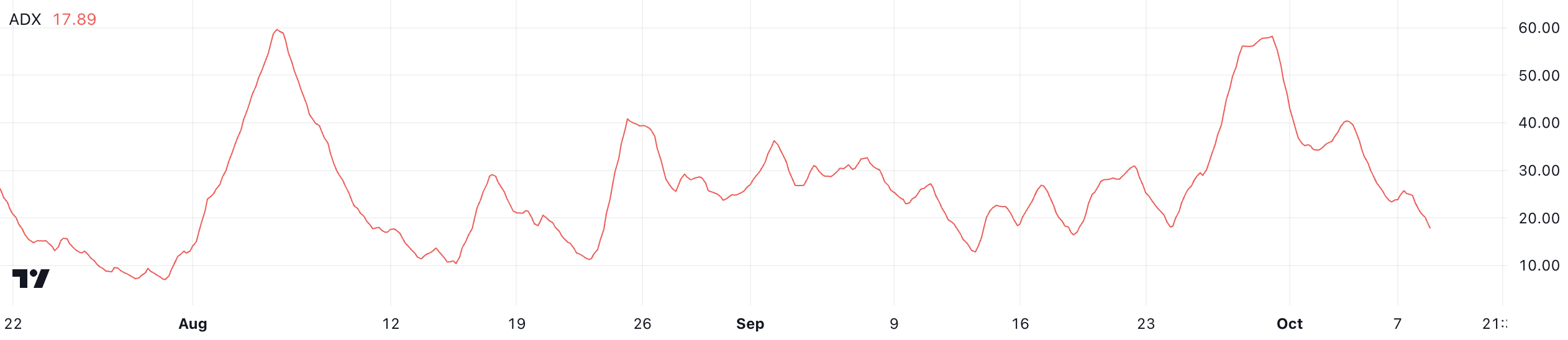 PEPEのADXは17.89に下がり、9月30日のピーク時58.52から大きく下落しました。当時のPEPEの取引価格は0.00001147ドルでした。ADX(平均方向指数)は、トレンドの強さを測定するために使用される主要な技術指標です。この測定は、トレンドが強気であるか弱気であるかにかかわらず行われます。