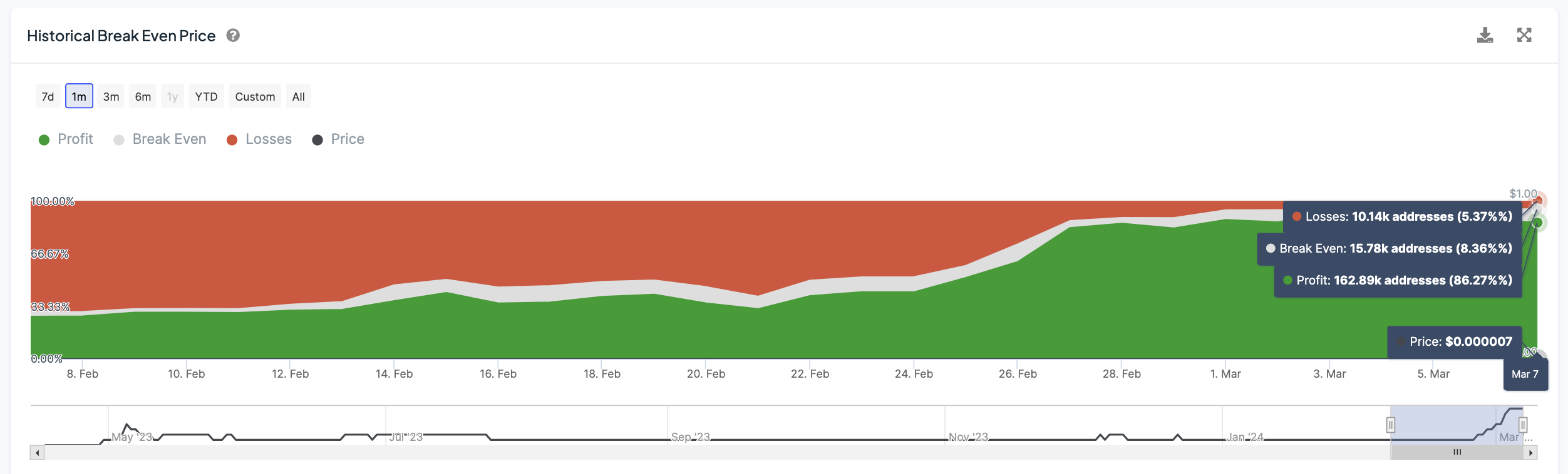 現在、利益を上げているPEPEホルダーの割合は86%で、およそ16万アドレスに相当する。わずか5日前、この数字は91%とわずかに高かった。このような落ち込みは、コインの強気の勢いの中で市場に飛び込む新規ホルダーの流入を考えると、予想されることであり、正常なことです。