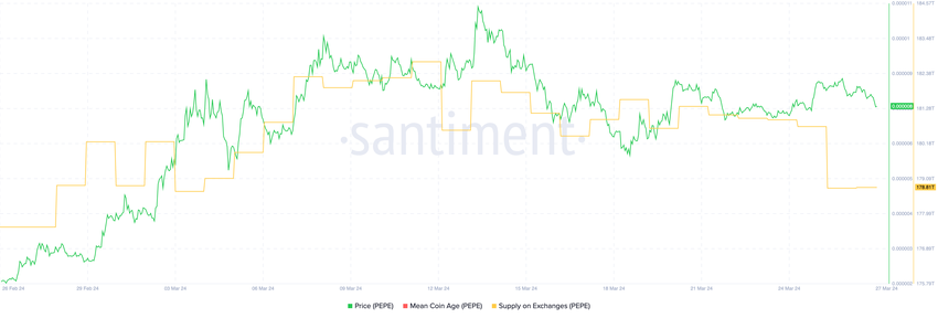 3月25日から26日にかけて、取引所におけるPEPEの供給量は180.7兆ドルから178.7兆ドルへと大幅に減少した。